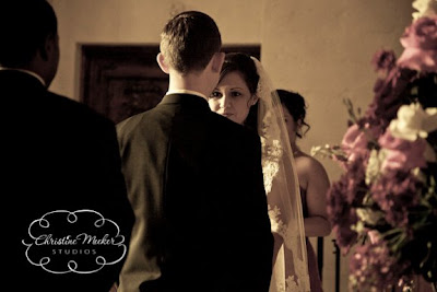 I so much enjoyed this New Year's day wedding of my sweet friend and co-worker, Kim. I was honored to be a part of J.P. and Kim's day by helping with the ceremony processional and other logistics. As you can see by the gorgeous photography (Christine Meeker Studios), the setting was beautifully Tuscan with deep crimson red colors, romantic candle-lit tables, dark oak wood doors, and sophisticated marble floors and columns.